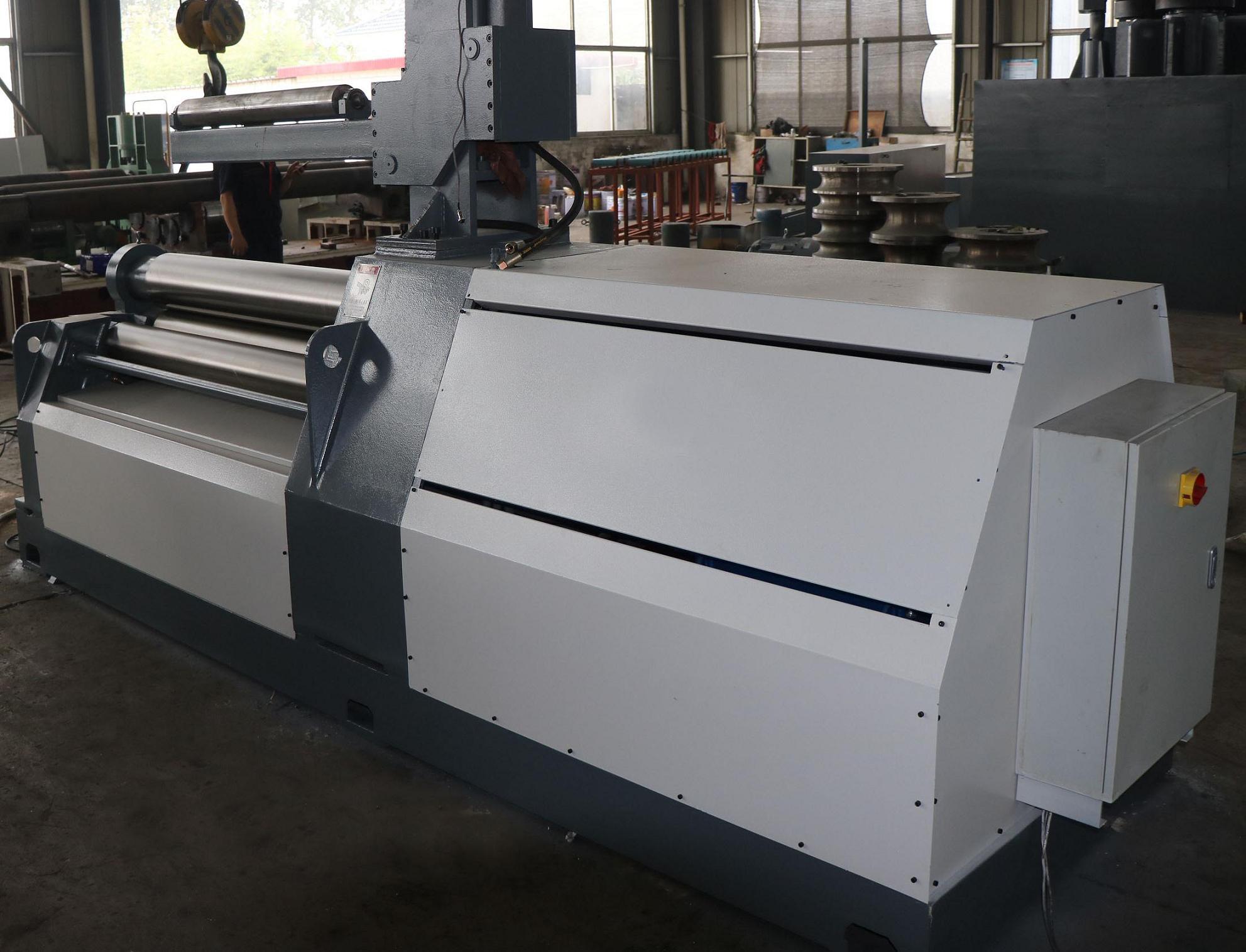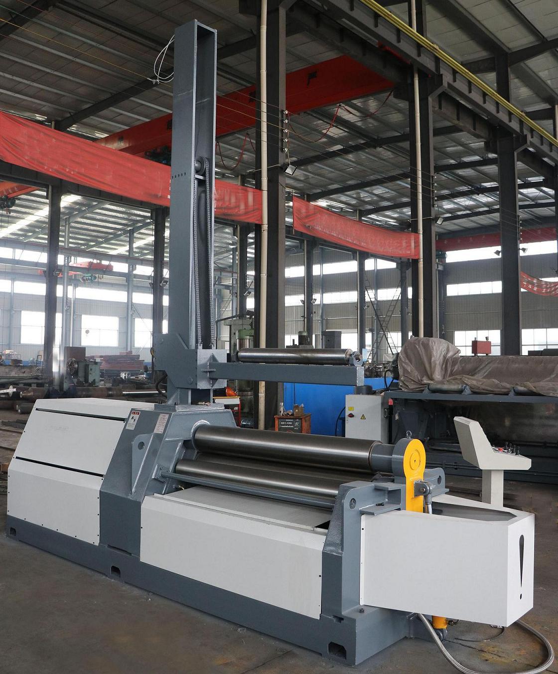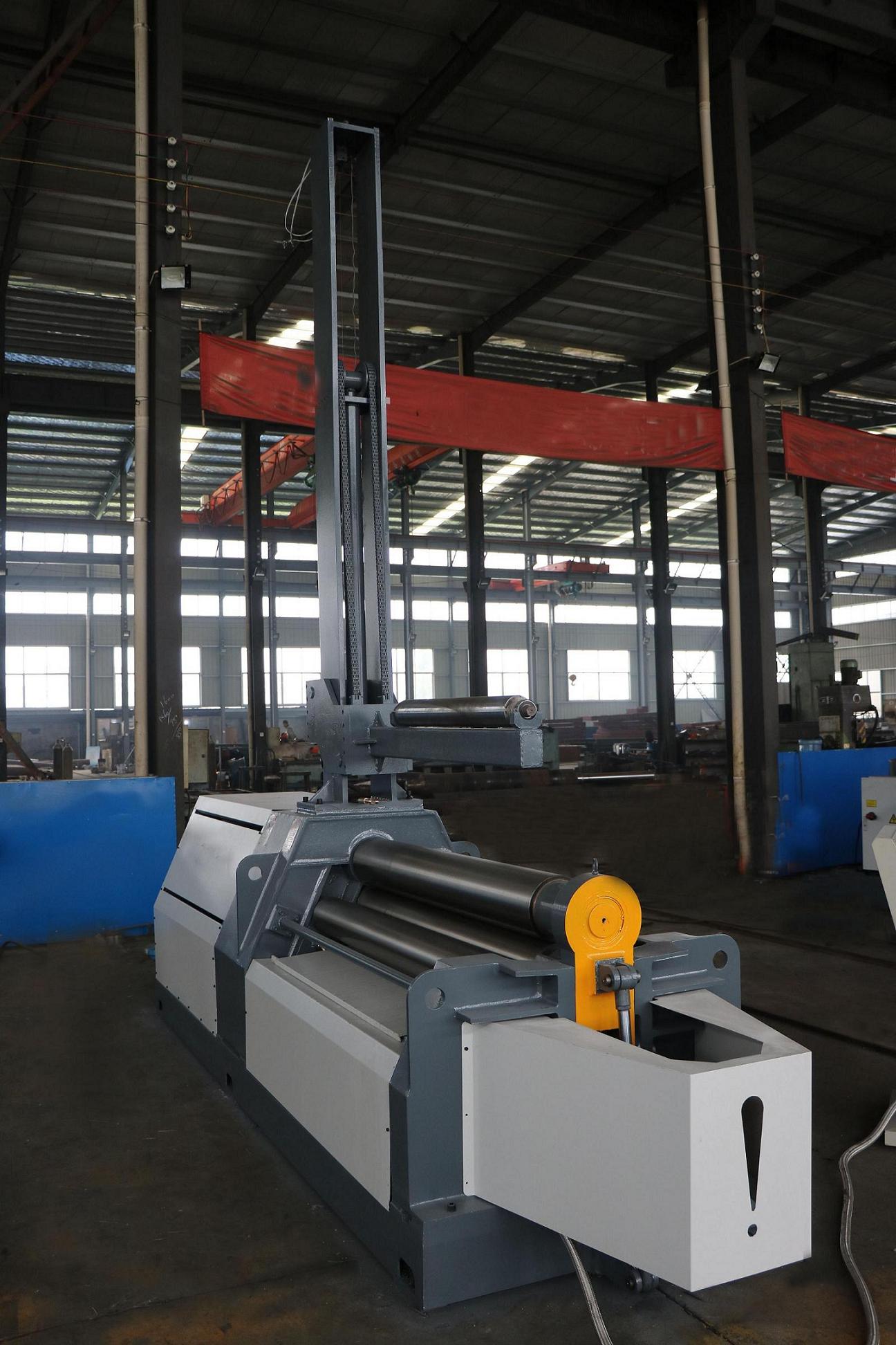 T4-8T1500W Plate Bending Machine is a type of double pinch plate bending machine. Each of the rollers is separate driven. Rollers rectilinear slide ways coated with antifriction material, no maintenance, suit to heavy duty loading, smooth and stable positioning. Spherical roller bearings are equipped on the rollers. All of the rollers in alloyed steel are induction hardening and heat treatment. All of the rollers will be grinded and polished after induction hardening treatment.