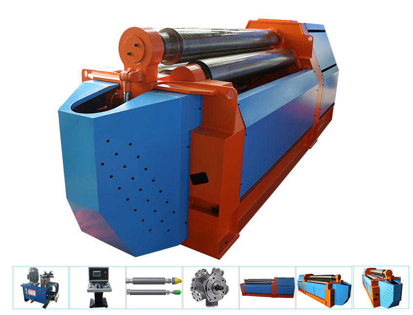 T4-20T3000W Plate Bending Machine is a type of double pinch plate bending machine. Each of the rollers is separate driven. Rollers rectilinear slide ways coated with antifriction material, no maintenance, suit to heavy duty loading, smooth and stable positioning. Spherical roller bearings are equipped on the rollers. All of the rollers in alloyed steel are induction hardening and heat treatment. All of the rollers will be grinded and polished after induction hardening treatment.