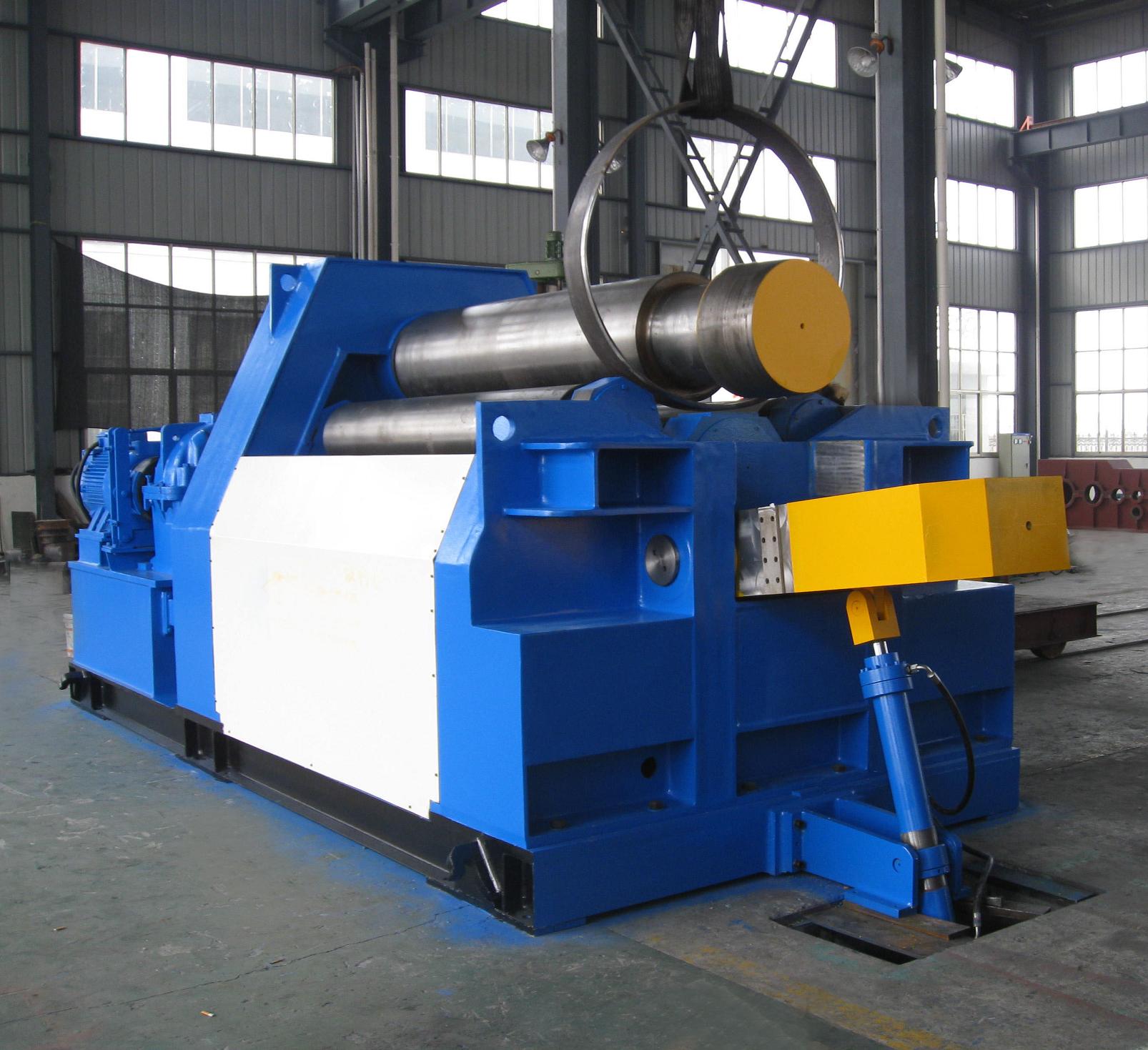 T4-40T2500W Plate Bending Machine is a type of double pinch plate bending machine. Each of the rollers is separate driven. Rollers rectilinear slide ways coated with antifriction material, no maintenance, suit to heavy duty loading, smooth and stable positioning. Spherical roller bearings are equipped on the rollers. All of the rollers in alloyed steel are induction hardening and heat treatment. All of the rollers will be grinded and polished after induction hardening treatment.Parameters