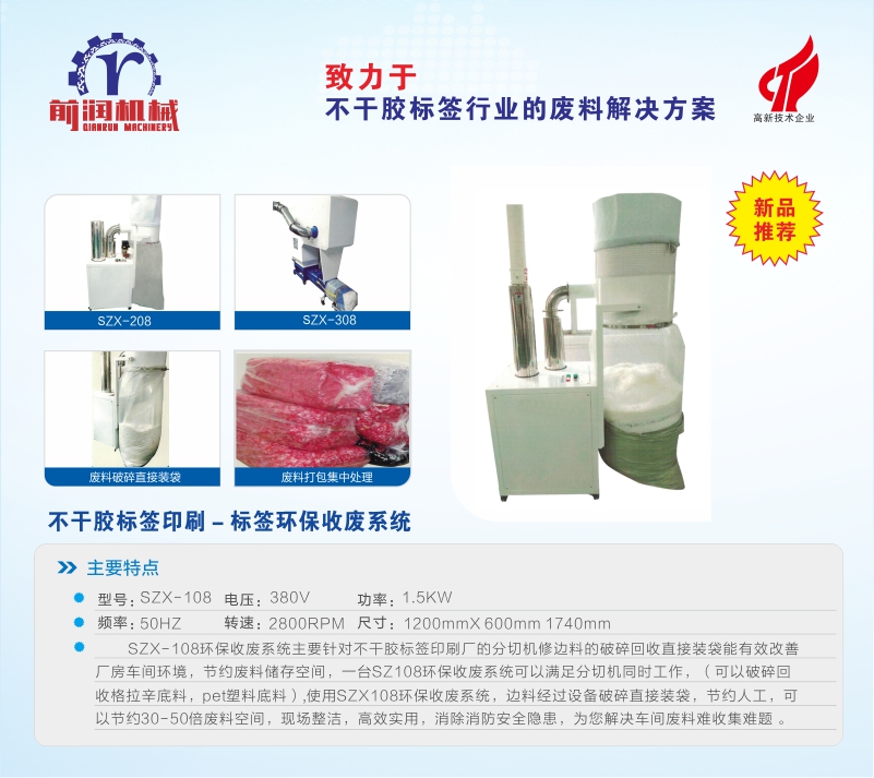 SZX-108 Eco-friendly Waste Collection System is aimed at recycling the scrap edges(Glassine or PET) which are produced by slitting machine from label printing factories. Equiped with SZX-108 system, the scrap edges are minced and bagged directly, which can improve the factory enviroment, save the storage space and eliminate safety hazards effectively.