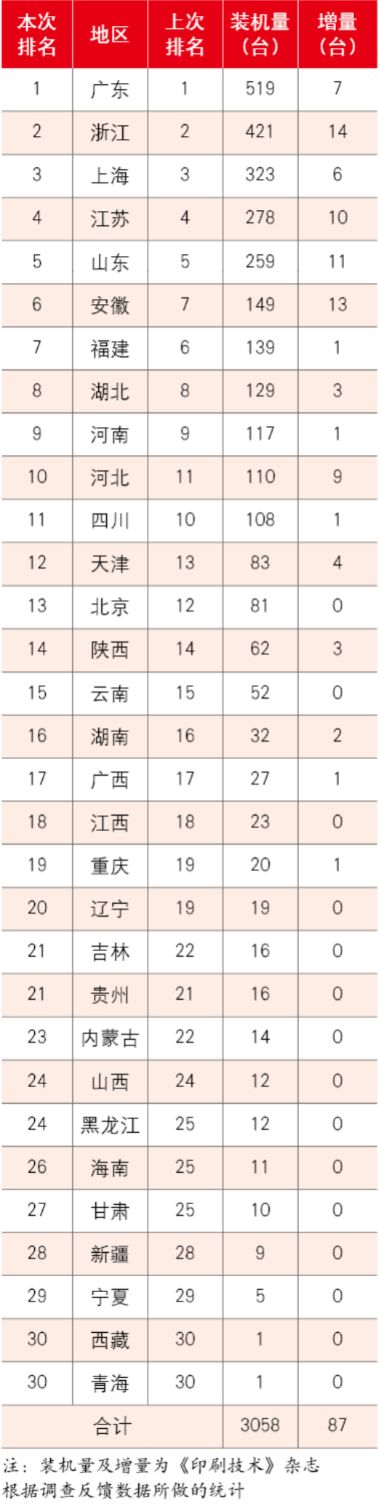 表2 2023年機組式柔性版印刷機地區(qū)裝機量、增量及排名