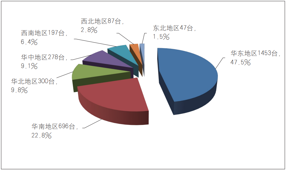 如圖3,從傳統(tǒng)地理分區(qū)來看,華東地區(qū)排在首位(增量為54臺),華南地區(qū)位居第二(增量為9臺),接下來依次是華北地區(qū)(增量為13臺)、華中地區(qū)(增量為6臺)、西南地區(qū)(增量為2臺)、西北地區(qū)(增量為3臺)、東北地區(qū)(增量為0臺)。