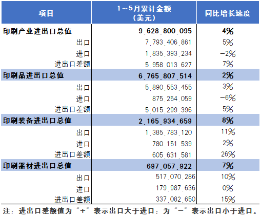 根據國家海關總署最新發布的統計數據,2024年1~5月國內印刷品、印刷裝備、印刷器材進出口總值為96.29億美元(參見表1),與去年同期相比增長4%。