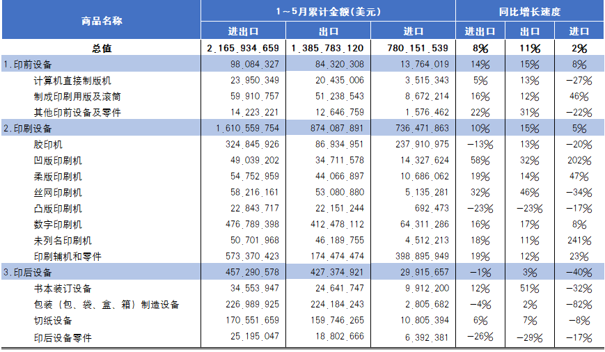 同期,印刷裝備主要出口品種變化:計算機直接制版機586臺、2043.50萬美元(同比增長13%);膠印機1835臺、8693.50萬美元(同比增長13%):凹版印刷機629臺、3471.16萬美元(同比增長32%);柔版印刷機621臺、4406.69萬美元(同比增長14%);絲網印刷機4.00萬臺、5308.09萬美元(同比增長46%);凸版印刷機2777臺、2215.12萬美元(同比下降23%);數字印刷機48.89萬臺、4.12億美元(同比增長17%);印刷輔機和零件1.74億美元(同比增長12%);書本裝訂設備2464.17萬美元(同比增長51%);包裝制造設備2.24億美元(同比增長2%);切紙設備1.60億美元(同比增長7%)