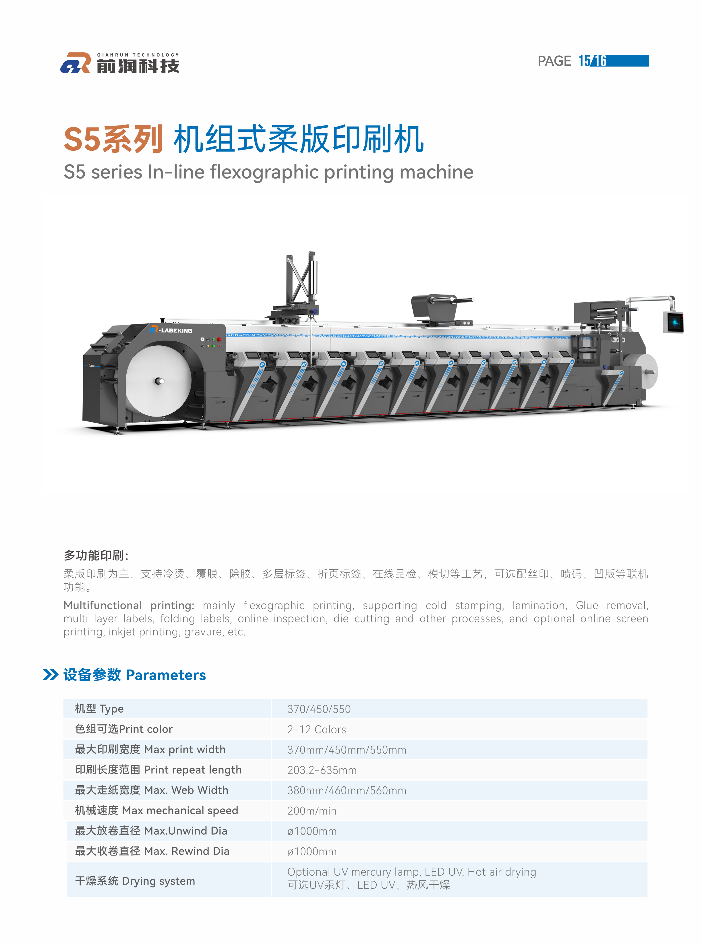 5??多功能印刷: 柔版印刷為主,支持冷燙、覆膜、除膠、多層標簽、折頁標簽、在線品檢、模切等工藝,可選配絲印、噴碼、凹版等聯(lián)機功能。
